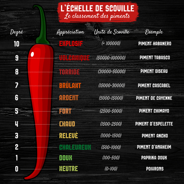 Ainsi les piments sont classés selon leur puissance sur une échelle de 10 degrés, 0 correspondant à Neutre et 10 à Explosif.